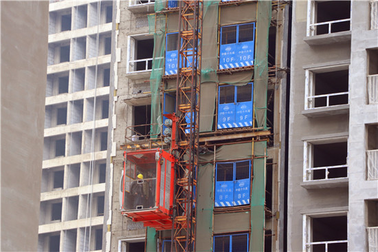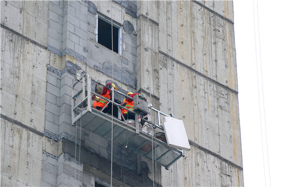 當(dāng)日上午,記者在施工現(xiàn)場看到,樓體外部,工人們隨著升降吊籃的上下正在緊張有序地進行外墻保溫施工;樓體內(nèi),工人們正在進行內(nèi)墻的粉刷及水泥地板的鋪設(shè),里里外外一派忙碌的景象。