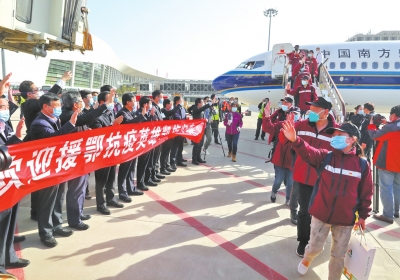 “英雄,英雄,你們最棒!”“白衣天使,歡迎回家!”3月19日16點(diǎn)左右,鄭州國(guó)際機(jī)場(chǎng)269停機(jī)坪響起熱烈的歡迎聲音,支援湖北的鄭州大學(xué)第一附屬醫(yī)院國(guó)家緊急醫(yī)學(xué)救援隊(duì)隊(duì)員和鄭州市直醫(yī)院的醫(yī)療隊(duì)隊(duì)員一起乘坐南航包機(jī)平安到家了。在接下來(lái)的一個(gè)小時(shí)里,又有兩架搭載支援湖北醫(yī)療隊(duì)隊(duì)員的南航包機(jī)相繼降落。至此,當(dāng)天共有453名河南抗疫勇士從武漢返家。
