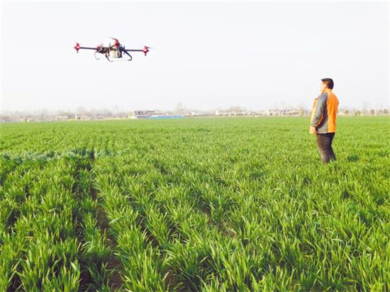3月24日,在沈丘縣周營鎮(zhèn)平安農業(yè)種植合作社訂單優(yōu)質小麥種植基地,身穿“黃馬甲”的小麥飛防技術員正操作無人機,進行“一噴多防”病蟲害防治,為夏糧豐產豐收奠定基礎。謝辛凌 攝