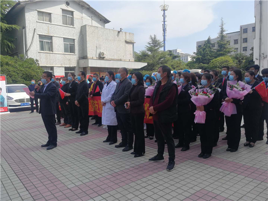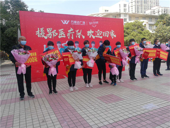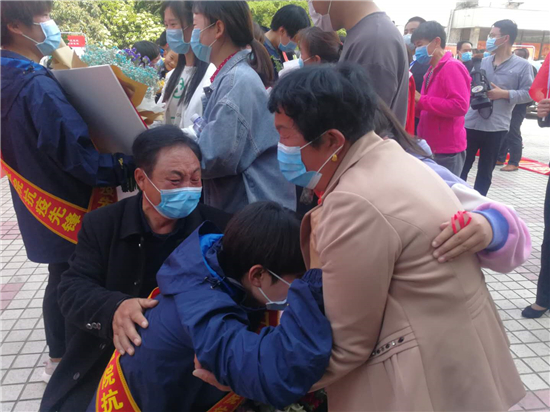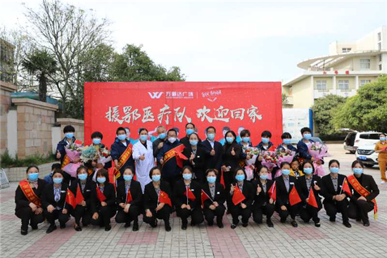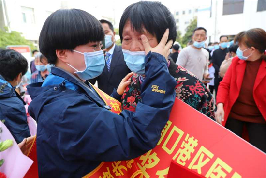 “送給你小心心,送你花一朵“在歡迎人員的手語(yǔ)舞的伴隨下,8位港區(qū)醫(yī)院援鄂醫(yī)療隊(duì)員和一位司機(jī)走出周口迎賓館解除隔離。4月1日,周口港區(qū)醫(yī)院援鄂醫(yī)療隊(duì)圓滿(mǎn)完成任務(wù)返回周口,在周口迎賓館隔離14天,4月15日下午,隔離期滿(mǎn),隊(duì)員們經(jīng)兩次核酸檢測(cè)呈陰性,達(dá)到了解除醫(yī)學(xué)觀(guān)察標(biāo)準(zhǔn)。