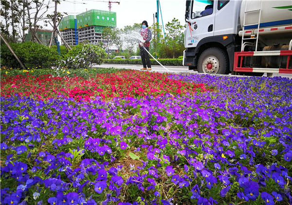 4月20日,在文昌大道道路綠化帶上,市政工人正在為栽種的花卉綠植補充水分。入春以來,我市城區(qū)一直在進行美化綠化,現(xiàn)在各個街道逐漸顯現(xiàn)出絢麗身姿。市民走在市區(qū)的每個街道都能看到各色花卉、綠植,很是養(yǎng)眼。