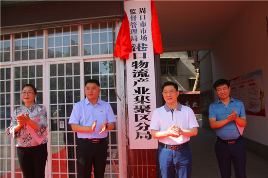 在新聞媒體和分局全體干部職工的見(jiàn)證下,孫紅偉、時(shí)乃立、干在慎、李素芹為周口市市場(chǎng)監(jiān)督管理局港區(qū)分局揭牌。