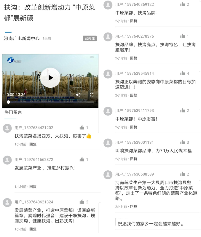 “扶溝蔬菜產(chǎn)業(yè)大發(fā)展,助推扶溝社會經(jīng)濟再上新臺階?!薄胺鰷鲜卟嗣麚P四方,大扶溝,厲害了?!薄敖许懼性硕计放?,樹立經(jīng)濟社會發(fā)展良好形象,讓扶溝跑起來。”網(wǎng)友們紛紛跟帖評論為自己的家鄉(xiāng)點贊。