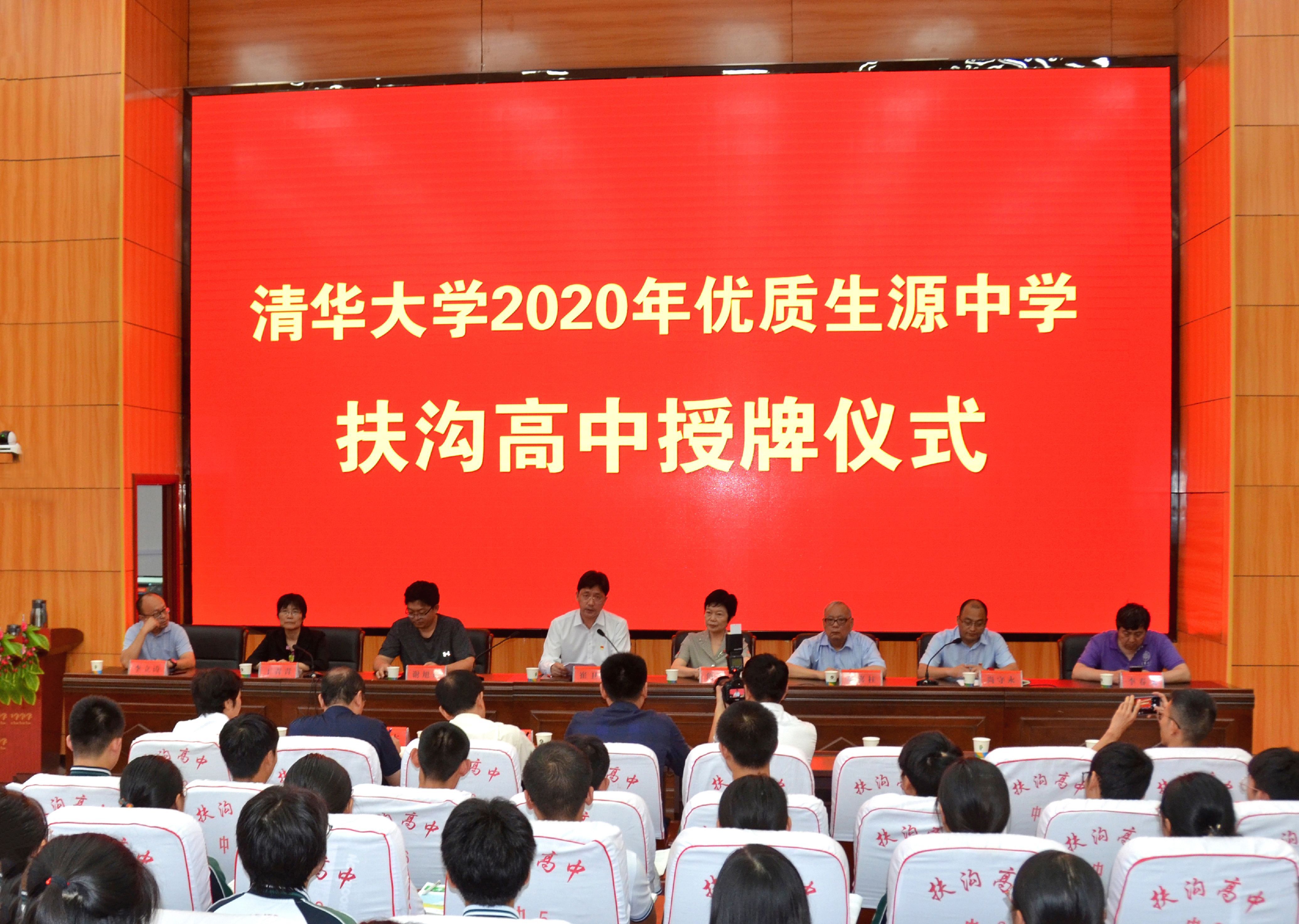8月21日,清華大學(xué)2020年生源中學(xué)授牌儀式在扶溝高中舉行。清華大學(xué)河南校友會會長詹玉榮,清華大學(xué)河南招生組組長謝旭東,河南校友會副會長車喜柱,清華大學(xué)河南招生組副組長丁青青等一行六人出席授牌儀式。縣長崔衛(wèi)國,縣委常委、縣委宣傳部部長尚守永出席授牌儀式。授牌儀式由尚守永主持。最后,謝旭東向扶溝高中校長馮鳳云授予“清華大學(xué)2020年生源中學(xué)”榮譽(yù)牌匾。