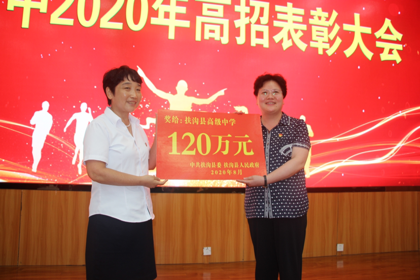8月31日上午,在扶溝高中2020年度高招表彰會現(xiàn)場,張穎波親手頒發(fā)了120萬元的獎勵金,其中60萬獎給被清華、北大錄取的新生,60萬獎給扶溝高中。