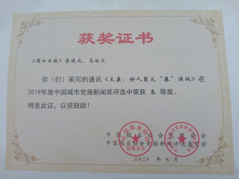 繼太康“五養(yǎng)模式”榮獲3項(xiàng)省級(jí)以上新聞大獎(jiǎng)之后,日前從周口報(bào)業(yè)集團(tuán)新聞研究室再次傳來好消息,《周口日?qǐng)?bào)》頭版刊發(fā)的太康“好人之城”通訊《太康:好人聚義“春”滿城》(作者:李建成 馬治衛(wèi))一文,榮獲中國(guó)城市黨報(bào)新聞獎(jiǎng)三等獎(jiǎng)。