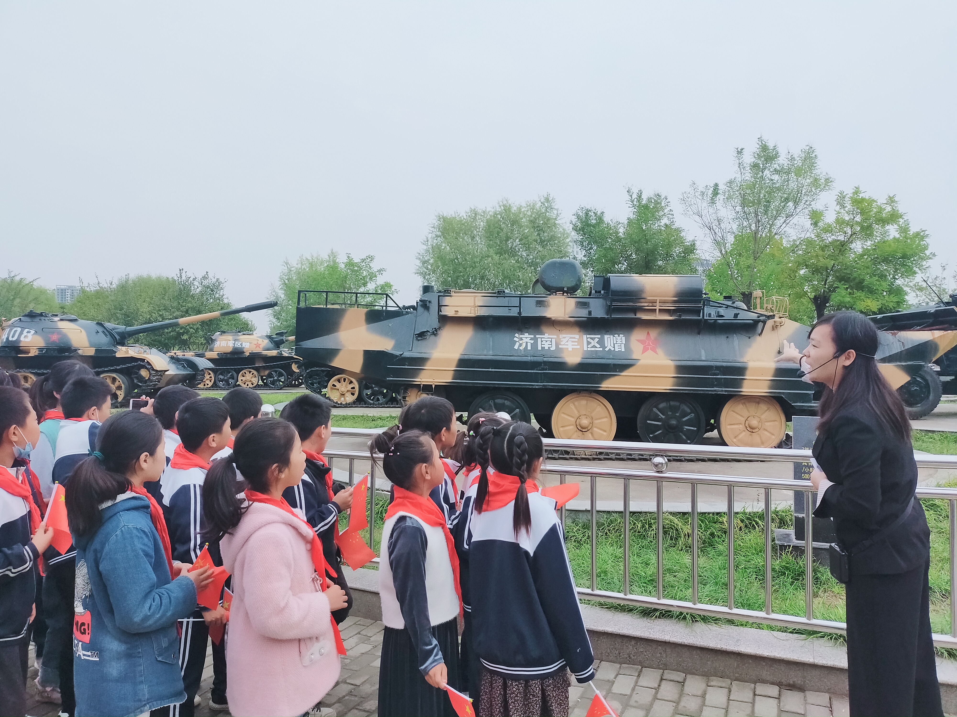 當(dāng)日10時(shí)許,在講解員的帶領(lǐng)下,學(xué)生們?cè)谥芸趪缊@參觀了坦克、火箭炮、榴彈炮、高射炮、飛機(jī)等軍事裝備,增長了國防知識(shí),受到了愛國主義教育。隨后,在主辦方志愿者的帶領(lǐng)下,學(xué)生們?cè)谲娕炁札R唱國歌共同慶祝祖國生日。