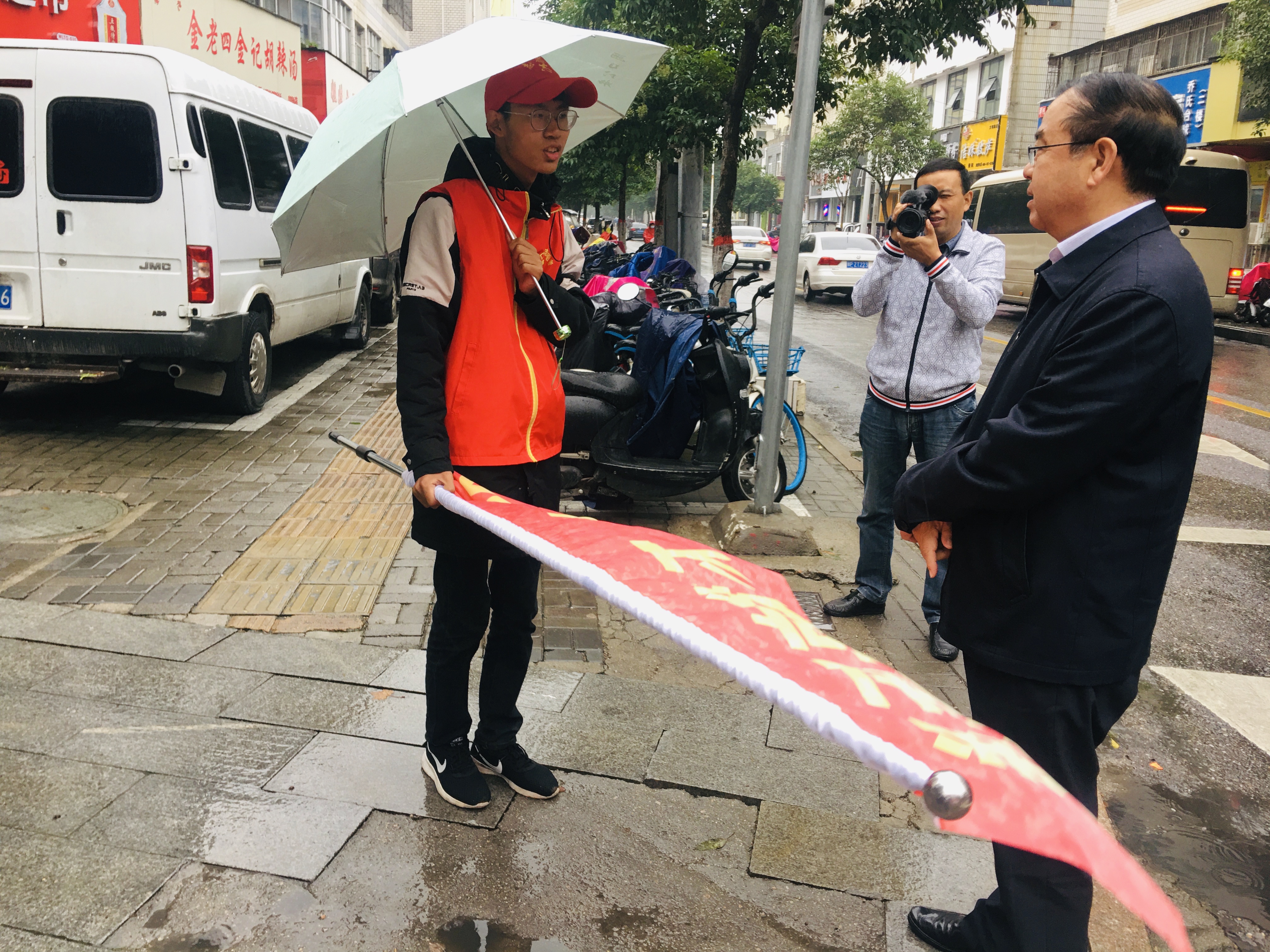 在文明路,劉國連由北向南隨機(jī)抽查分包單位工作人員和志愿者在崗情況,履行“路長制”職責(zé)。當(dāng)看到他們在雨中或疏導(dǎo)交通或打掃衛(wèi)生,劉國連幾次上前對他們認(rèn)真負(fù)責(zé)的工作態(tài)度進(jìn)行了表揚(yáng),對“創(chuàng)文”工作做出的貢獻(xiàn)表達(dá)敬意。他說,現(xiàn)在是“創(chuàng)文”決戰(zhàn)決勝最后沖刺的關(guān)鍵時刻,希望大家繼續(xù)發(fā)揚(yáng)奉獻(xiàn)精神,發(fā)揮好志愿者的作用,為“創(chuàng)文”做出新的貢獻(xiàn)。