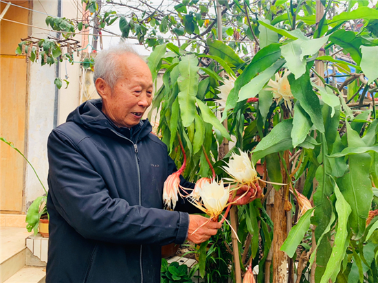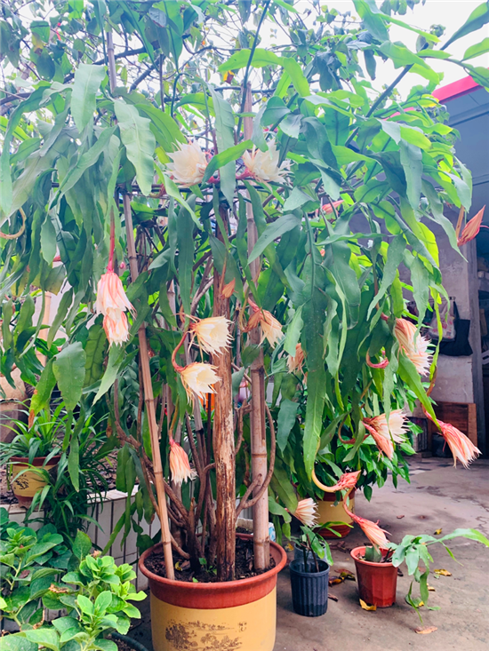 在周口市中心城區(qū)的一個(gè)家屬院里,記者見到了88歲的苗天才和他養(yǎng)的曇花,“一株21年樹齡的曇花開了43朵,另外兩株5年樹齡的曇花加起來開了13朵,這3株曇花一共開了56朵?!泵缣觳耪f,早上四五點(diǎn)的時(shí)候曇花就慢慢地開放了,到現(xiàn)在五六個(gè)小時(shí)過去了曇花還保持著開放狀態(tài)。