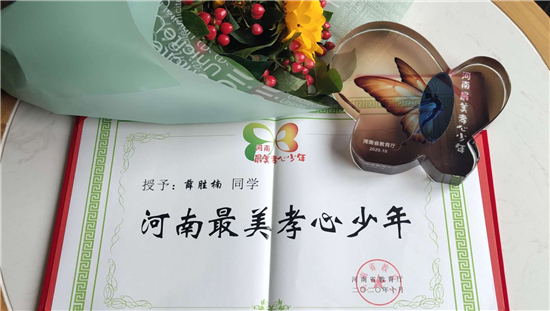 10月20日,河南省第二屆“河南最美孝心少年”頒獎(jiǎng)典禮在河南省實(shí)驗(yàn)學(xué)校鄭東小學(xué)舉行,全省表彰10名“河南最美孝心少年”,分別頒發(fā)獎(jiǎng)杯、證書和1萬(wàn)元獎(jiǎng)勵(lì)。省教育廳副廳長(zhǎng)毛杰等領(lǐng)導(dǎo)為孝心少年頒獎(jiǎng)并合影留念。鄲城縣汲水二中學(xué)生薛勝楠光榮受獎(jiǎng)。