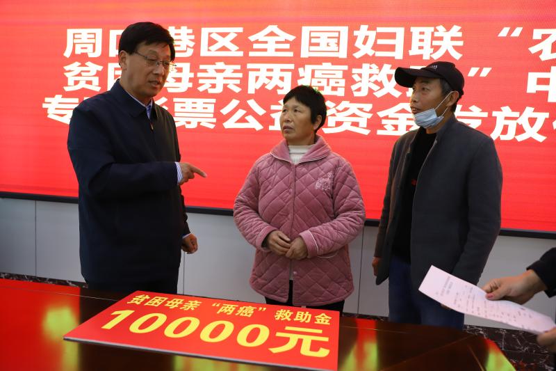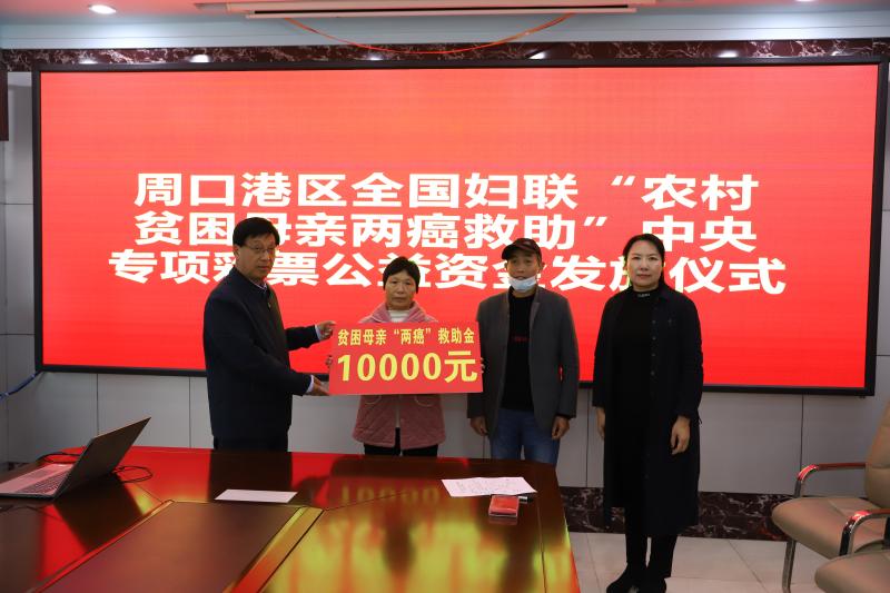 11月19日上午,周口港區(qū)婦聯(lián)舉行全國婦聯(lián)“農(nóng)村貧困母親兩癌救助”中央專項(xiàng)彩票公益金資金發(fā)放儀式,向受到救助的李埠口鄉(xiāng)苑老村的“兩癌”貧困母親李貴平發(fā)放救助金1萬元。周口港區(qū)黨委委員張東立、港區(qū)婦聯(lián)副主席劉影及相關(guān)工作人員參加了發(fā)放儀式。