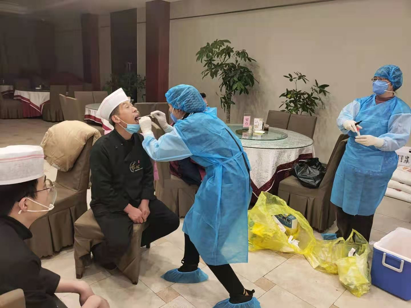 為助力第一屆周商大會圓滿成功,市衛(wèi)生健康委抽調(diào)近百名調(diào)精兵強將組成衛(wèi)生保障專班開展衛(wèi)勤保障工作。圖為工作人員在市委黨校迎賓館和體育賓館餐廳對后廚人員做核酸檢測及開展冷鏈?zhǔn)称废尽?/p>