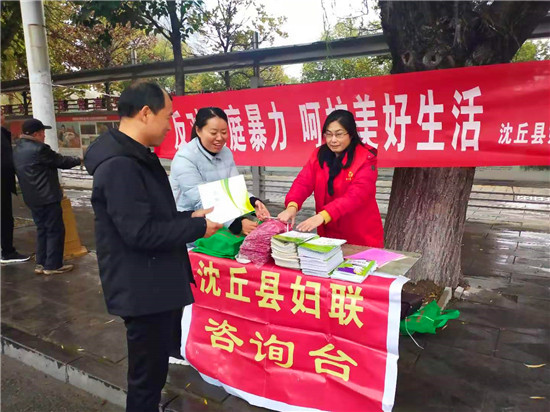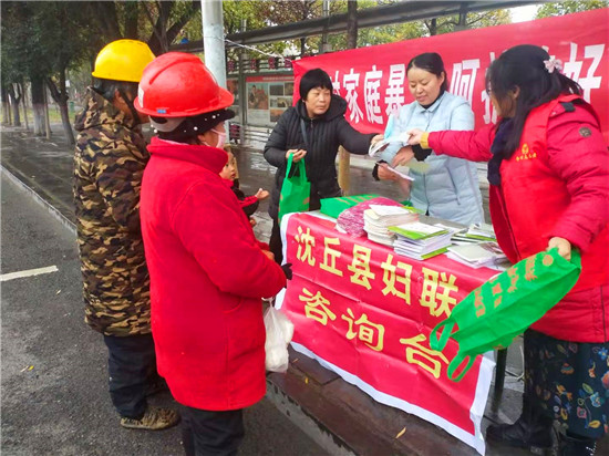 11月25日是國際反家庭暴力日。為進(jìn)一步提高全社會反家庭暴力意識,加大對《反家庭暴力法》的宣傳,有效預(yù)防和制止家庭暴力,促進(jìn)家庭和諧,保障婦女群眾在婚姻家庭中的合法權(quán)益。為此,沈丘縣婦聯(lián)在城區(qū)組織開展了以“反對家庭暴力,呵護(hù)美好生活”為主題的法治宣傳活動。