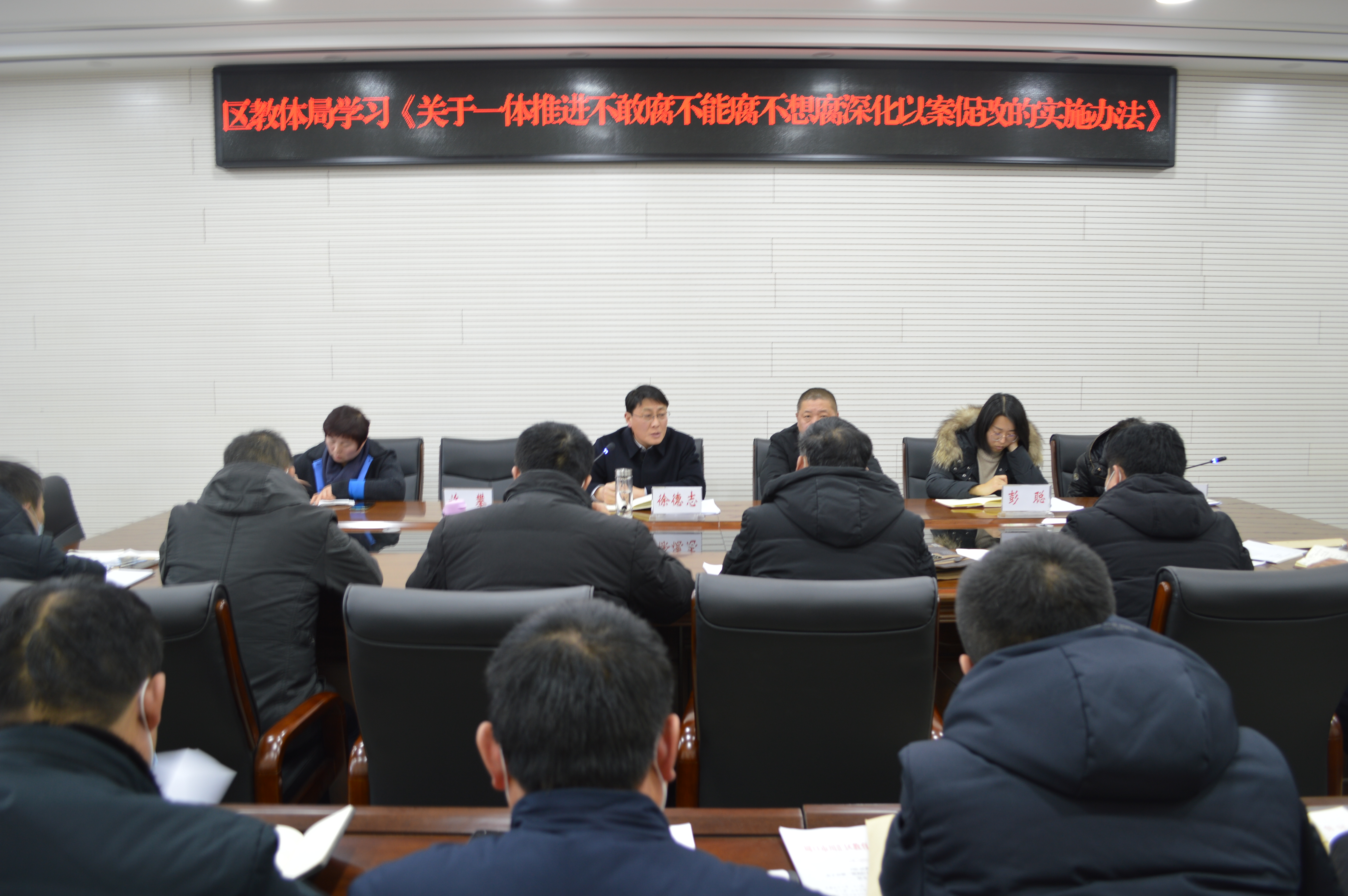 川匯區(qū)教體局黨組書記、局長徐德志強調,要把思想和行動統(tǒng)一到一體推進“三不”深化以案促改工作中,通過反思剖析教育體育系統(tǒng)近年來發(fā)生的違紀違法案件,深入查找風險漏洞,強化警示教育,整改突出問題,健全完善制度,促進權力結構配置更加科學、權力運行更加規(guī)范透明,教育引導黨員干部堅定理想信念、增強黨性觀念、提高道德修養(yǎng)、強化紀律意識,一體推進不敢腐不能腐不想腐機制建設,持續(xù)營造學的氛圍、嚴的氛圍、干的氛圍,為推動全區(qū)教育體育事業(yè)高質量發(fā)展提供堅強的政治保證。