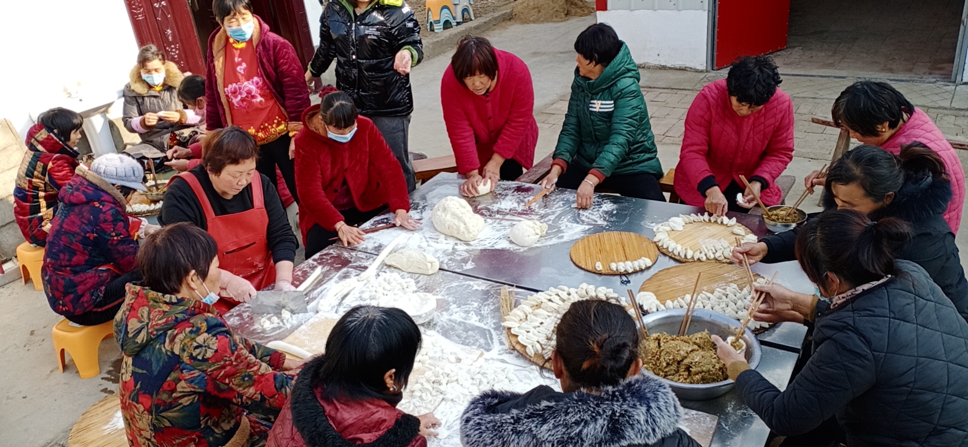 鄉(xiāng)村大食堂院子里,大家有說(shuō)有笑,圍在數(shù)平方米的巨大案板前,個(gè)個(gè)拿出了看家本領(lǐng),分工協(xié)作,揉面、搟皮、包餃子,個(gè)個(gè)動(dòng)作嫻熟,包起餃子來(lái)麻利干練,不知不覺(jué)間,面前的盤(pán)子里就擺滿(mǎn)了餃子。