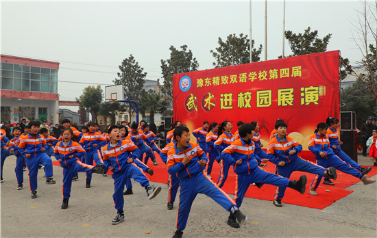 “嘿!哈!”“嘿!哈!”……12月28日,一聲聲鏗鏘有力而又充滿童稚的喊聲,在商水縣譚莊鎮(zhèn)豫東精致雙語學(xué)校上空回蕩。由該校800多名學(xué)生參加的第四屆武術(shù)進(jìn)校園展演活動正在舉行。
