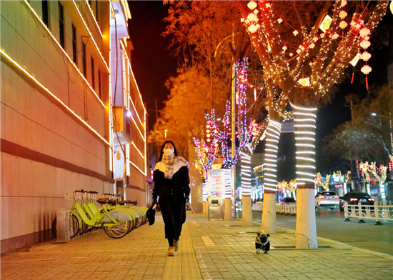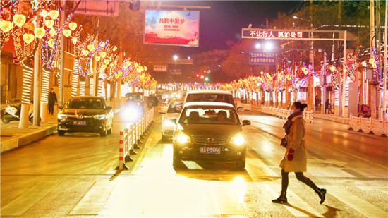 1月7日晚,扶溝縣城桐丘路,放眼望去,整條街道裝飾得色彩繽斕,形式各異的燈飾流光溢彩,美不勝收。景觀(guān)樹(shù)搖身一變,成了五彩繽紛的“星星樹(shù)”,一串串紅燈籠高高掛起,一顆顆“中國(guó)心”錯(cuò)落有致,格外引人注目,引得路過(guò)的市民紛紛駐足拍照留念。