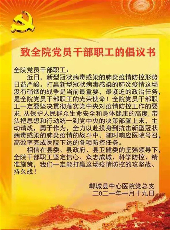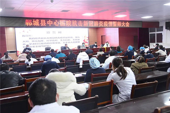 當(dāng)晚的誓師大會(huì)由副院長(zhǎng)馬金來(lái)主持。黨總支書(shū)記梁麗宣讀了《致全院黨員干部員工倡議書(shū)》,發(fā)熱門(mén)診主任楊蔚、預(yù)檢分診護(hù)士長(zhǎng)呂秋珍、呼吸重癥科副主任邢懷廣分別代表各系統(tǒng)員工積極響應(yīng),做表態(tài)發(fā)言。