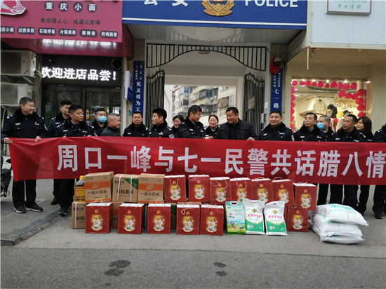 “臘八,臘八,凍掉下巴?!迸D八前后是一年里最為寒冷的時(shí)節(jié)。1月20日臘八節(jié)當(dāng)天,愛心企業(yè)為川匯區(qū)公安分局七一路派出所民警送來慰問品,讓一線基層民警倍感溫暖。該分局副局長(zhǎng)周保、治安大隊(duì)長(zhǎng)袁剛專程趕到慰問現(xiàn)場(chǎng),代表分局黨委對(duì)愛心企業(yè)的到來表示感謝。