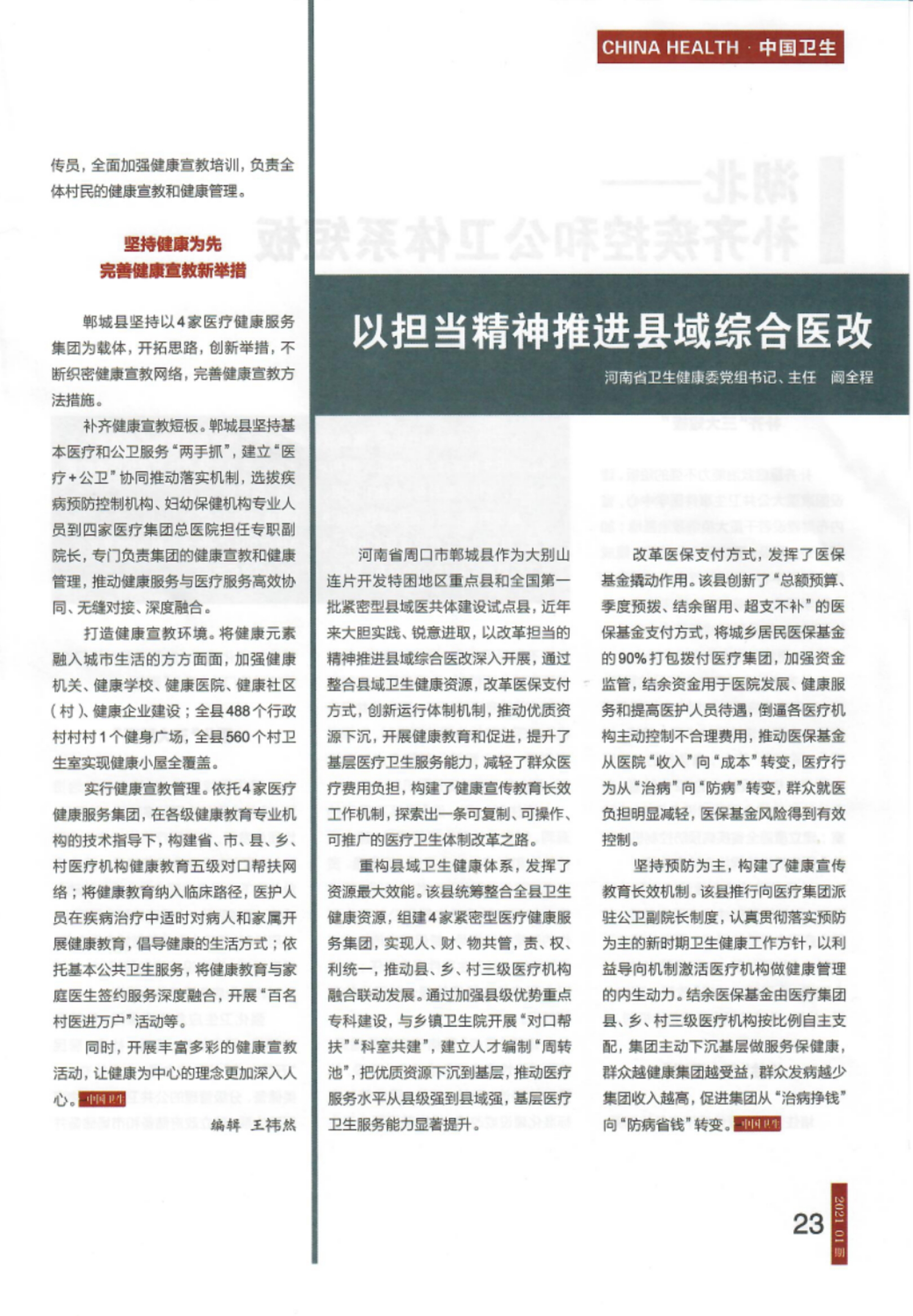由國(guó)家衛(wèi)生健康委主管的《中國(guó)衛(wèi)生》雜志2021年元月刊深度報(bào)道了《河南——緊密型醫(yī)共體主推鄲城縣健康宣教走深走實(shí)》。期刊特別刊發(fā)河南省衛(wèi)生健康委員會(huì)黨組書記、主任闞全程以《以擔(dān)當(dāng)精神推進(jìn)縣域綜合醫(yī)改》為題的推介文章。