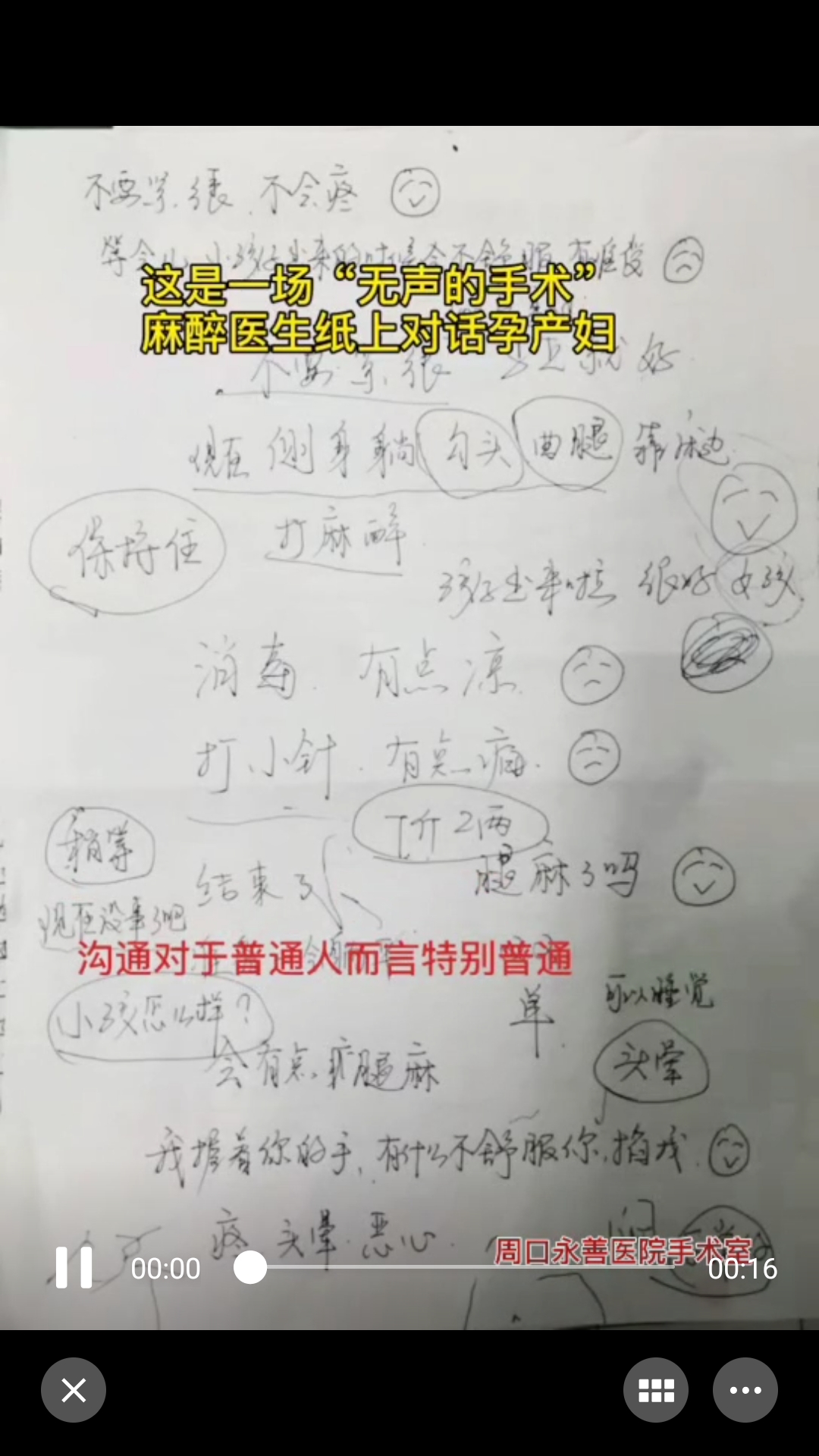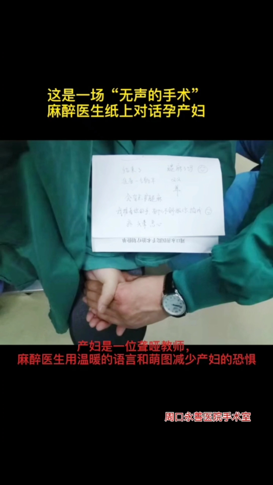 2月1日,記者終于找到小視頻的主角——周口永善醫(yī)院麻醉醫(yī)生張軍杰。他回憶道:“幾天前,我們接診一名產(chǎn)婦,她是一名聾啞教師,有語(yǔ)言障礙。手術(shù)中,為了好溝通,我就找來一張紙,在紙上一直問她‘腿麻了嗎?’我握著你的手,有什么不舒服你掐我’,并鼓勵(lì)她‘不要緊張,不會(huì)疼’‘堅(jiān)持住’,有時(shí),我還在紙上給她畫些網(wǎng)絡(luò)小表情、萌圖,緩解她緊張的情緒。慢慢,原本心情緊張的她逐漸放松下來?!?/p>