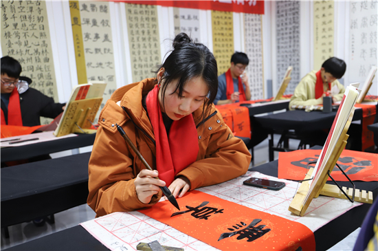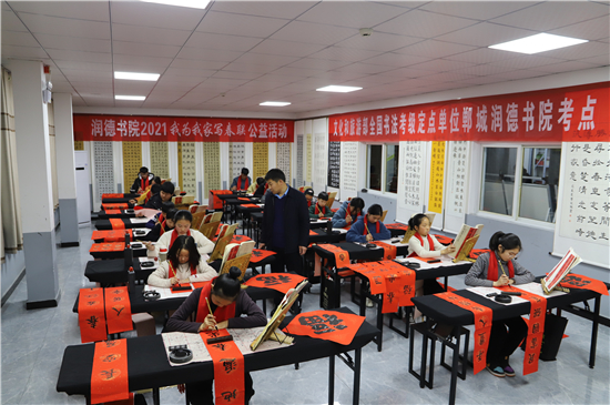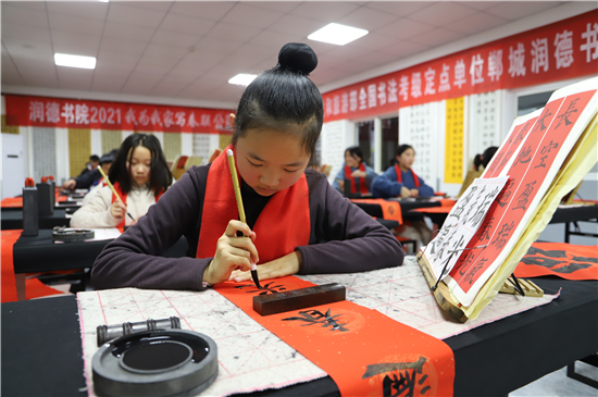 2月3日,記者在鄲城縣潤德書院看到,“我為我家寫春聯(lián)”活動(dòng)正緊張地進(jìn)行著,數(shù)十名書法小學(xué)員端坐案前、從容執(zhí)筆、揮毫作書,一個(gè)個(gè)福字工整又靈活,一副副對聯(lián)娟秀又詩意。孩子們在屋內(nèi)全神貫注地寫字,把最美好的祝福用自己的所學(xué)展示給家庭;家長們在窗外掂腳張望,望子成龍、望女成鳳的心態(tài)表露無遺。