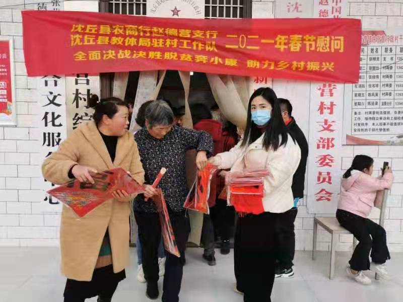 村室外邊,縣教體局駐村工作隊長李小兵、村干部不停地把一幅幅火紅的春聯(lián)遞到村民的手上,并和大家互道祝福:“鄉(xiāng)親們,新年好,牛年好運。”