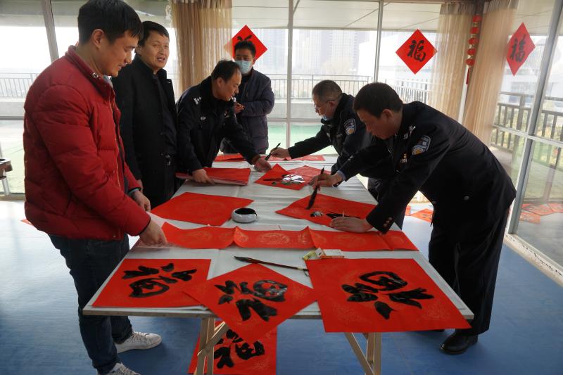 金牛賀歲來祥瑞,翰墨飄香迎新春。為弘揚(yáng)中華傳統(tǒng)文化,落實(shí)“從優(yōu)待警”舉措,傳遞市局黨委的親切慰問和關(guān)心關(guān)懷,豐富警營文化生活,營造歡樂祥和的節(jié)日氛圍,2月9日,項(xiàng)城市公安局在三樓大廳開展書贈春聯(lián)活動,孫沄、閆永紅等5名警營書法家及16名蓮溪書院師生揮毫潑墨,現(xiàn)場為民警、輔警及工作人員義寫春聯(lián)、福字2000余套,受到了廣大民警、輔警的熱烈歡迎和充分好評。