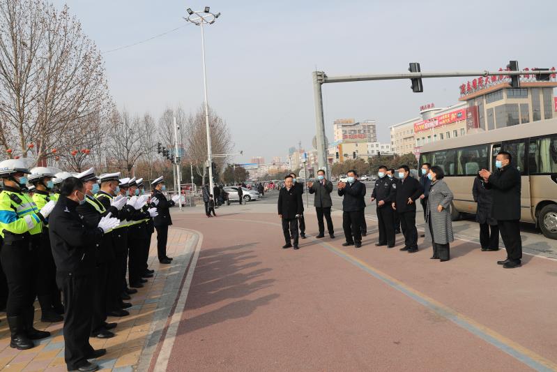 在縣人民廣場(chǎng),最后王國(guó)璽、李錫勇一行看望慰問(wèn)了正在執(zhí)勤的交警,與他們親切交談,對(duì)大家一年來(lái)作出的努力和貢獻(xiàn)表示感謝。勉勵(lì)廣大干警發(fā)揚(yáng)甘于奉獻(xiàn)、勇于擔(dān)當(dāng)?shù)木瘢S護(hù)好全縣社會(huì)大局穩(wěn)定,確保全縣人民度過(guò)一個(gè)歡樂(lè)祥和的節(jié)日。