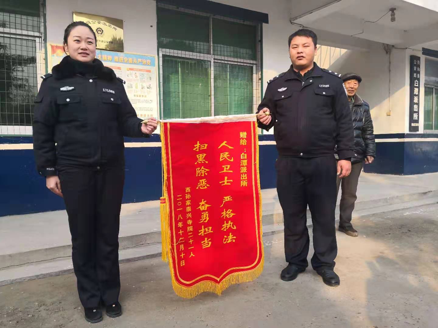 圖片說明:張寧博(右)收到群眾送來的錦旗。(資料圖片)