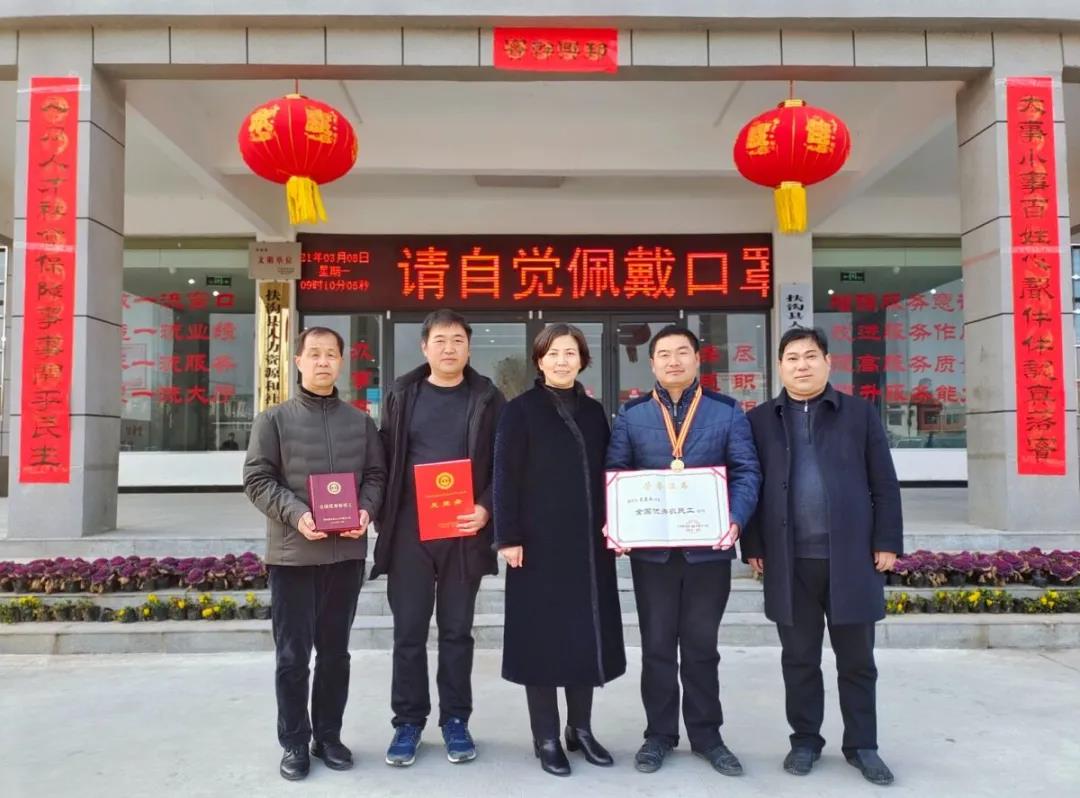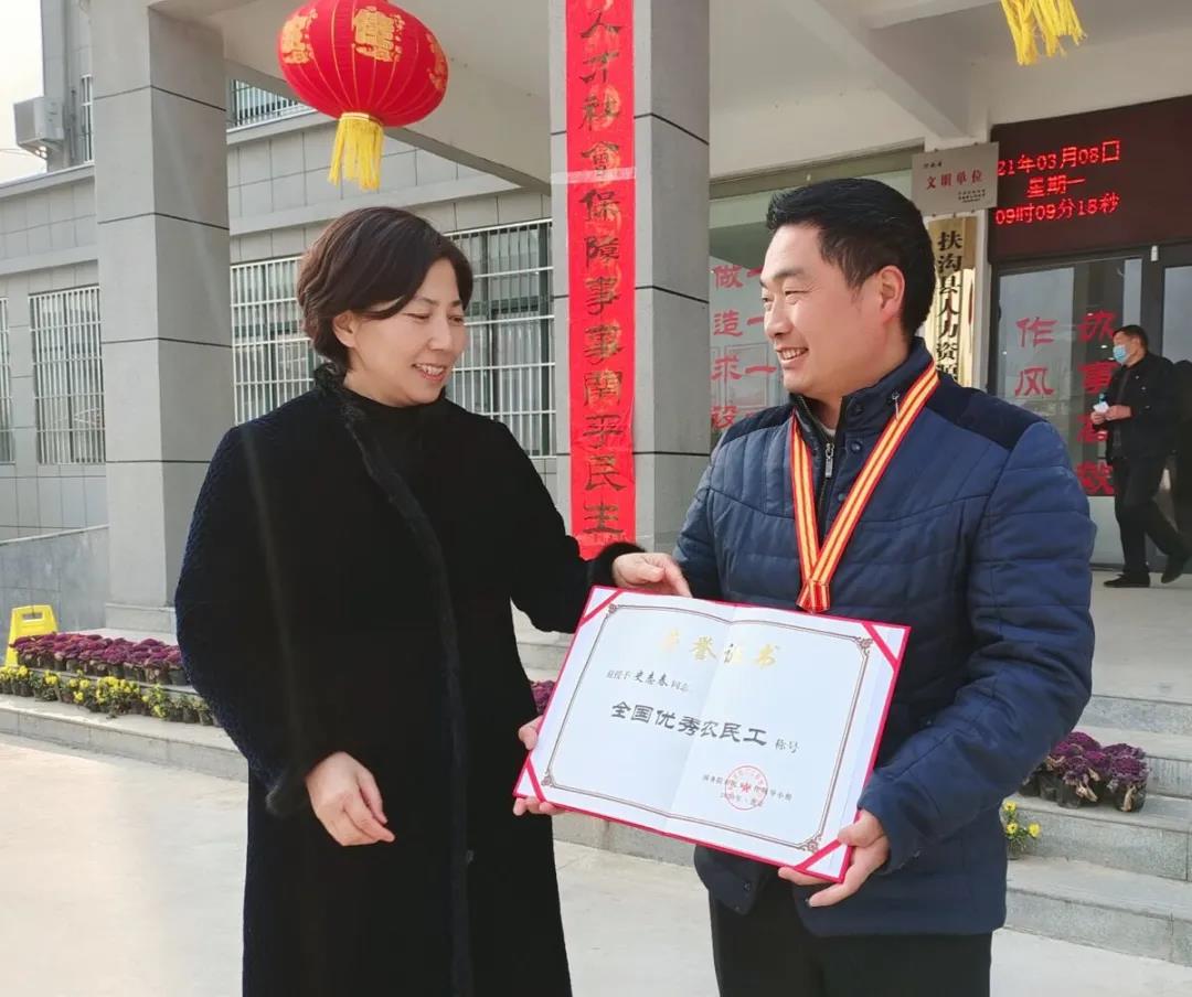3月8日,在扶溝縣人社局辦事大廳門(mén)前,縣人社局黨組書(shū)記、局長(zhǎng)張艷玲將“全國(guó)優(yōu)秀農(nóng)民工”獎(jiǎng)?wù)?、榮譽(yù)證書(shū)、光榮冊(cè)送到河南省天驕樂(lè)器股份有限公司木工段段長(zhǎng)史志春手上,對(duì)其獲得“全國(guó)優(yōu)秀農(nóng)民工”榮譽(yù)稱(chēng)號(hào)表示祝賀,勉勵(lì)他珍惜榮譽(yù)、再接再厲,以更優(yōu)異的成績(jī),為扶溝縣鄉(xiāng)村振興加油助力。②7
