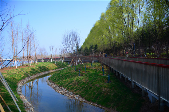 3月9日,魚翔湖曲廊環(huán)繞、新樹挺立,水面波光粼粼,不少市民漫步其中感受這水清岸綠 魚翔淺底的美景。