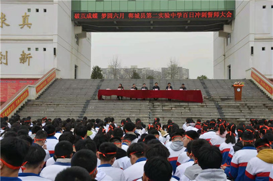 “為了花的綻放,為了根的夢想,讓我們舉起右拳,莊嚴宣誓!” 3月16日,鄲城縣第二實驗中學舉行中考百日沖刺誓師大會,全體九年級教師列隊主席臺前,用莊嚴的態(tài)度向學校許下鄭重的承諾??h教體局辦公室主任胡健康,校長朱玉良、校黨支部書記韓長江、副校長李德偉和九年級全體師生以及家長代表共同參加會議。會議由九年級級段主任段彬主持。