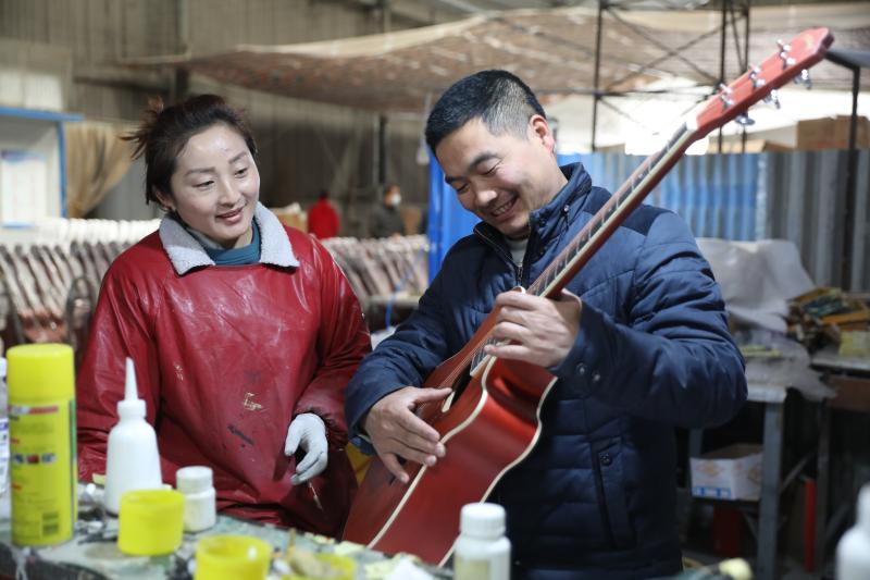 如今,天驕吉他總投資達500萬元,占地2萬平方米,建筑面積7000平方米,吸納農(nóng)民工60余人,每人年均收入達6-8萬,完全達到了異地高薪就業(yè)的標準,同時帶動當?shù)剡\輸、餐飲等300余人實現(xiàn)就地就近就業(yè)。