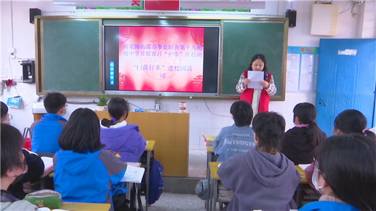 3月16日下午,川匯區(qū)荷花路街道辦事處新時(shí)代文明實(shí)踐所組織志愿者走進(jìn)第十八初級(jí)中學(xué),開展春日“護(hù)苗”在行動(dòng) “掃黃打非”進(jìn)校園主題教育活動(dòng)。