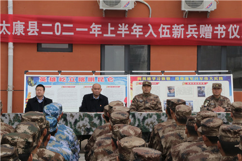 于永前表示,此次贈書儀式意義重大,體現(xiàn)了縣委、縣政府對太康縣2021年上半年新兵的關(guān)心和厚愛;體現(xiàn)了全縣160萬父老鄉(xiāng)親對我縣即將入伍的190名新兵的期望和重托;希望每名同志安心入伍,踏實工作,把太康縣好的光榮傳統(tǒng)及各個家庭好的家風(fēng)帶到部隊,把太康水東精神帶到部隊,在部隊建功立業(yè)。