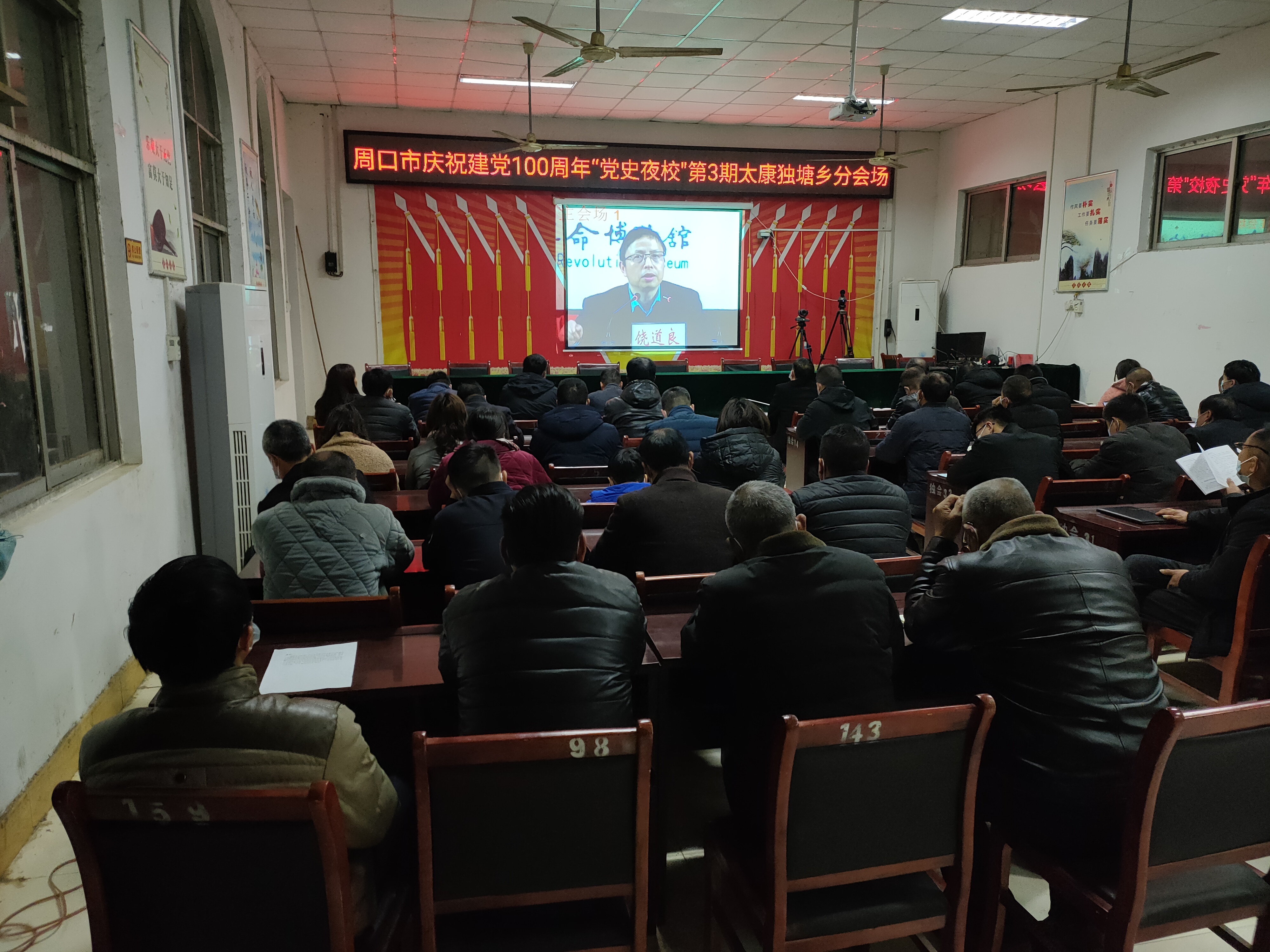 3月18日晚,周口市舉辦慶祝中國(guó)共產(chǎn)黨成立100周年“黨史夜校”第三期專(zhuān)題講座。太康縣獨(dú)塘鄉(xiāng)組織鄉(xiāng)領(lǐng)導(dǎo)班子、鄉(xiāng)政府機(jī)關(guān)黨支部全體黨員、34個(gè)行政村支部書(shū)記、鄉(xiāng)直機(jī)關(guān)負(fù)責(zé)人、各行政村全體黨員、兩委干部在鄉(xiāng)政府會(huì)議室和各行政村分會(huì)場(chǎng)收聽(tīng)收看。