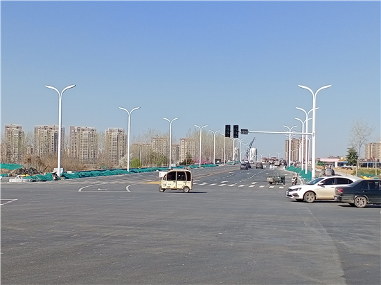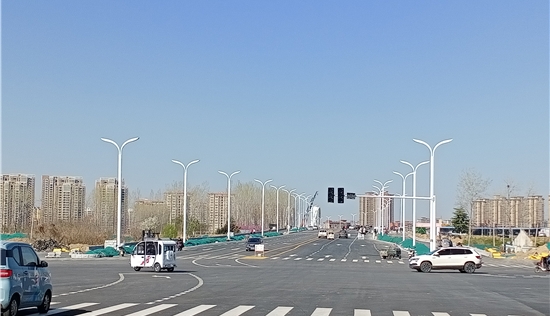 圖片說明:3月22日下午,記者在周口市中心城區(qū)中原路跨沙潁河大橋南側(cè)看到,一個(gè)個(gè)嶄新的路燈桿出現(xiàn)在道路兩側(cè)。藍(lán)天白云下,這些路燈桿顯得格外醒目,既扮靚了大橋,又方便了市民出行。
