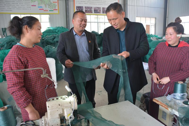 3月27日,商水縣平店鄉(xiāng)李崗村“商水縣龍巢網業(yè)公司”經理羅國昌向村黨支部書記李金棋(左二)介紹漁網編織產業(yè)產銷帶貧情況。羅國昌和妻子劉清華2009年創(chuàng)辦漁網編織加工廠、2017年擴建新區(qū),現有3個大型生產車間庫房,發(fā)展30多個分廠、40多個聯系點,年產各種成品漁網500萬條,產品銷往國內江蘇、安微、山東、河北、湖北等10多個省區(qū)和30多個沿海縣市水產公司,部分出口到俄羅斯及東南亞地區(qū),年創(chuàng)產值約1.6億元,精準幫扶225戶群眾脫貧,帶貧群眾有1萬余人。