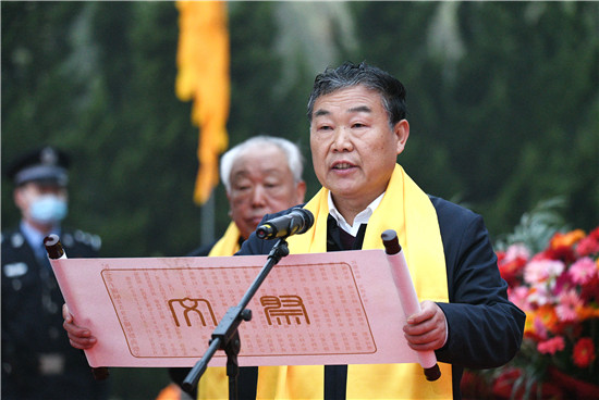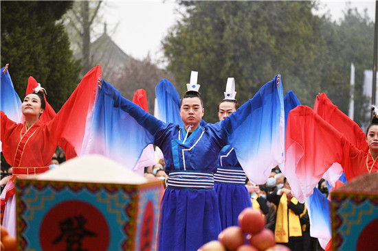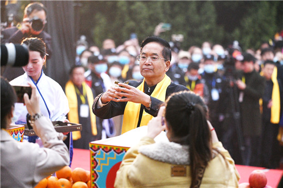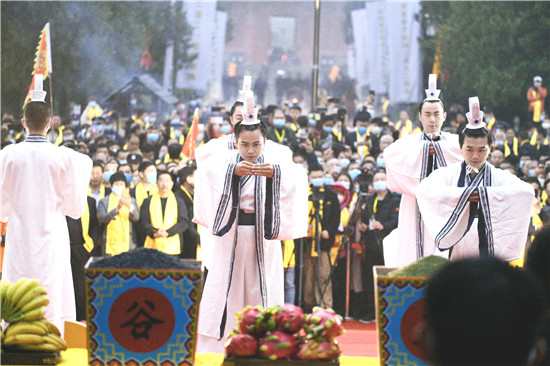 祭祀現(xiàn)場的長條桌上擺著水果和五谷,祭祀活動按照傳統(tǒng)禮儀進行,在莊嚴的古樂及禮炮聲中,先由身著古裝的群體祭祀者以古老禮俗進行祭拜,而后進行獻爵、恭讀祭文,隨后參加祭祀活動的社會各界代表獻上花籃,依次祭拜,表達對我們一代先哲的緬懷。
