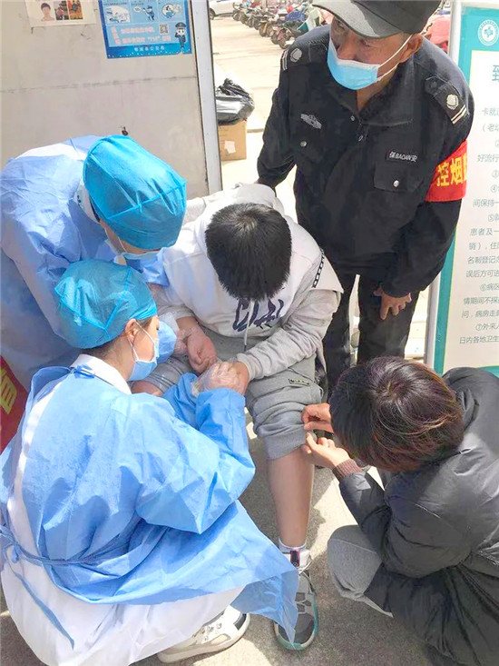鄲城縣中心醫(yī)院預(yù)檢分診醫(yī)生譚松月,護(hù)士趙哲哲、徐曼曼見(jiàn)狀連忙上前,在保安的協(xié)助下,將孩子攙扶到醫(yī)院門(mén)口。