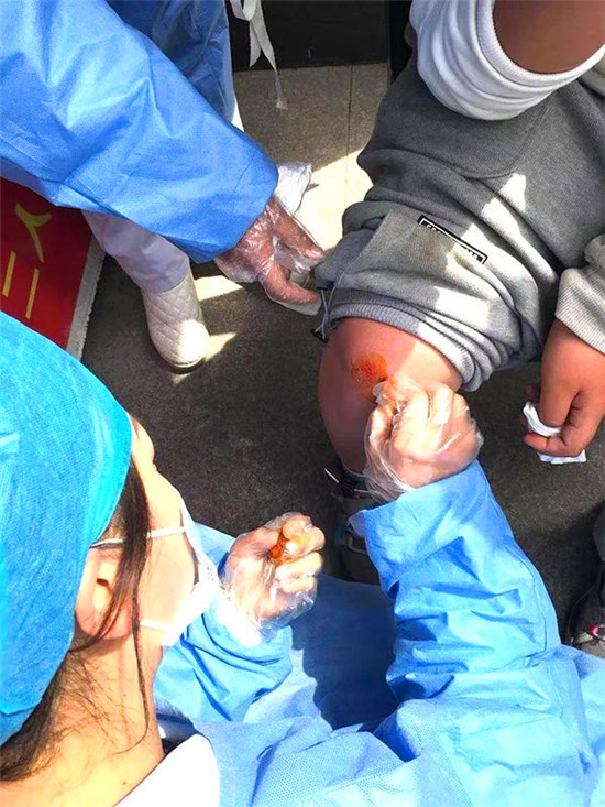 醫(yī)護(hù)人員檢查無(wú)大礙,拿來(lái)碘伏、棉球、紗布為其包扎消毒傷口。同時(shí)安慰孩子,電話(huà)聯(lián)系家長(zhǎng),直至將孩子交給家長(zhǎng)。