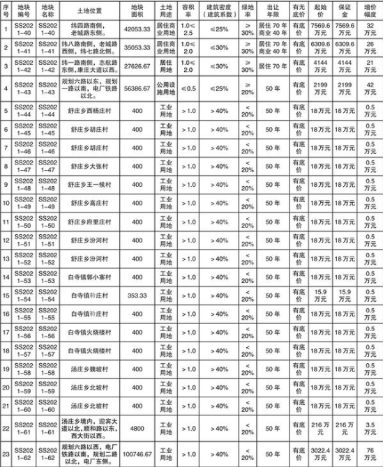備注:(1) SS2021-40號(hào)土地商業(yè)建筑面積不大于地塊地上總建筑面積的10%,地上附屬物由國(guó)資局負(fù)責(zé)處理。(2)SS2021-41號(hào)土地商業(yè)建筑面積不大于地塊地上總建筑面積的10%。(3) SS2021-44號(hào)至SS2021-61號(hào)用于風(fēng)力發(fā)電項(xiàng)目,統(tǒng)一規(guī)劃建設(shè),競(jìng)買人須同時(shí)報(bào)價(jià)競(jìng)買。