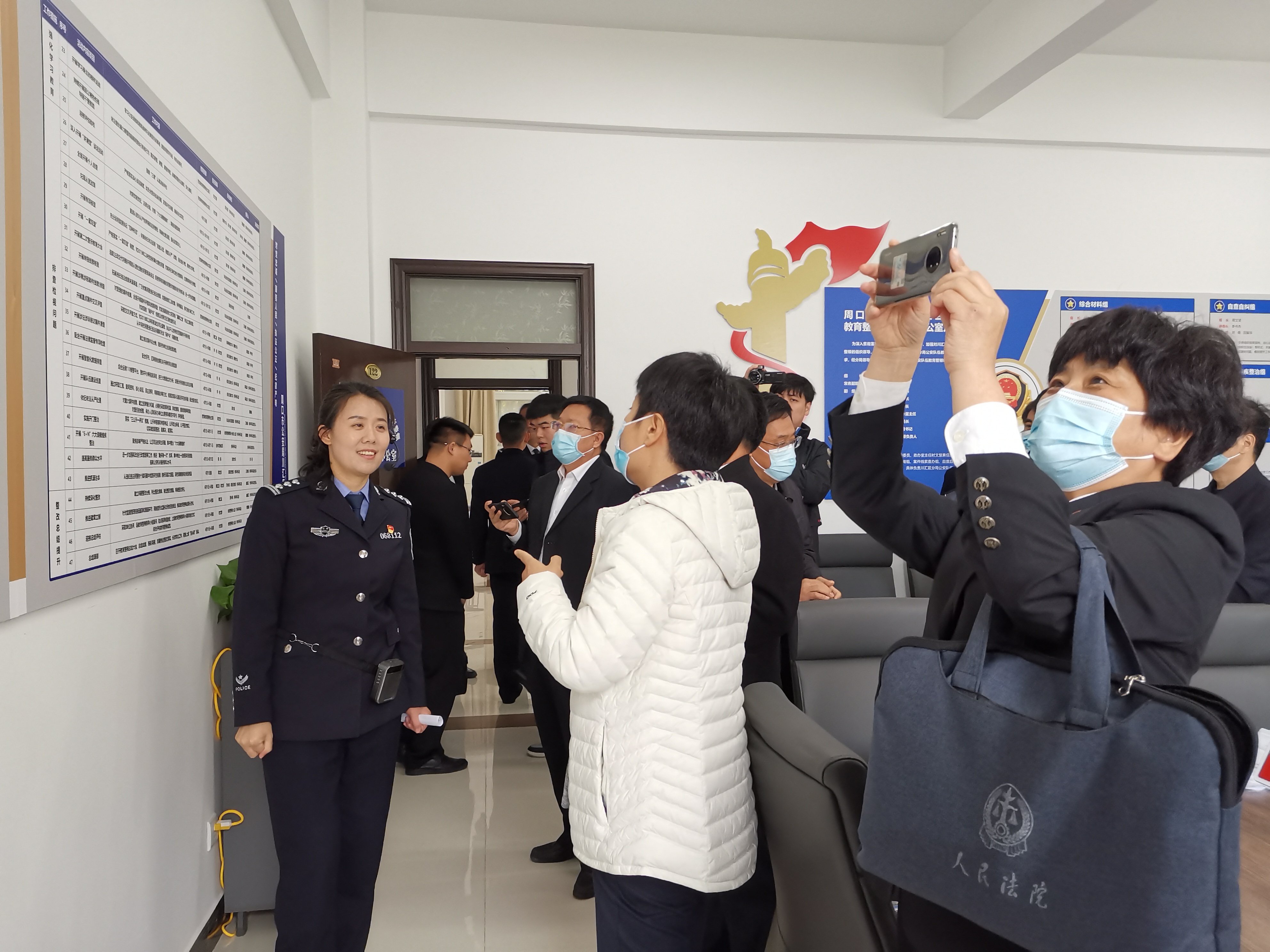 “ 鐵一般理想信念、鐵一般的責(zé)任擔(dān)當(dāng)、鐵一般的過硬本領(lǐng)、鐵一般的紀(jì)律作風(fēng)?!闭驹诖▍R區(qū)公安分局大門口,一樓大廳四個立柱上的“四鐵”紅色標(biāo)語格外醒目。在當(dāng)天的參觀交流中,考察組一行人一下車就開始拍照留存、暢談交流。他們在英模宣傳欄旁駐足觀看,在“政法隊(duì)伍教育整頓墻”前拍照留存,在教育整頓領(lǐng)導(dǎo)小組辦公室內(nèi)認(rèn)真翻看。整齊的資料匯編、厚厚的讀書筆記、散發(fā)著墨香的心得體會都成了大家拍照留念的“主角”。聽完分局政辦室主任時文慧主任的介紹后,參觀人員對川匯區(qū)公安分局的在政法教育整頓中所做的工作有了更深的認(rèn)識,大家紛紛為分局拼搏務(wù)實(shí)、一絲不茍的工作作風(fēng)點(diǎn)贊。