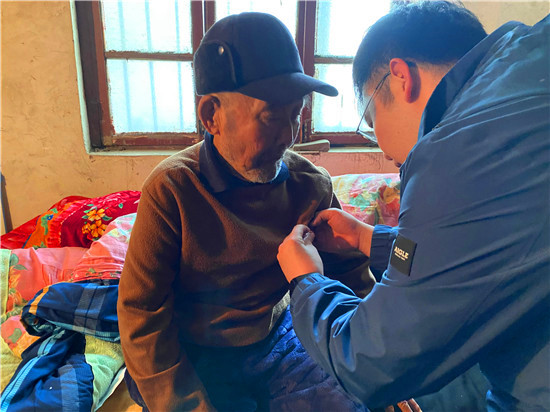 “快,我把你扶起來,年輕黨員來看你啦?!币粊淼蕉盼钠胬先说募抑校覀兙涂吹蕉盼钠娴睦习樵跀v扶著杜文奇起來。因?yàn)槟隁q已高,杜文奇身患多種疾病,很多事情已經(jīng)不能清晰地回憶,聽力也減退了,但當(dāng)給杜文奇戴上黨徽時(shí),我們看到他眼含熱淚,仿佛過去64年的黨員生活在面前一一浮現(xiàn)。