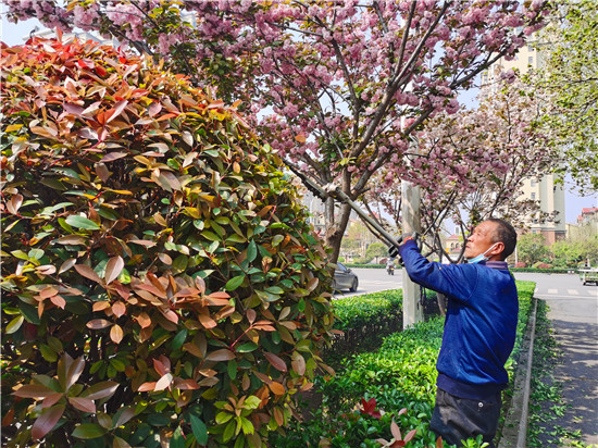 4月8日上午,周口市城鄉(xiāng)一體化示范區(qū)的園藝工人正在修剪周口大道綠化帶里的綠植。