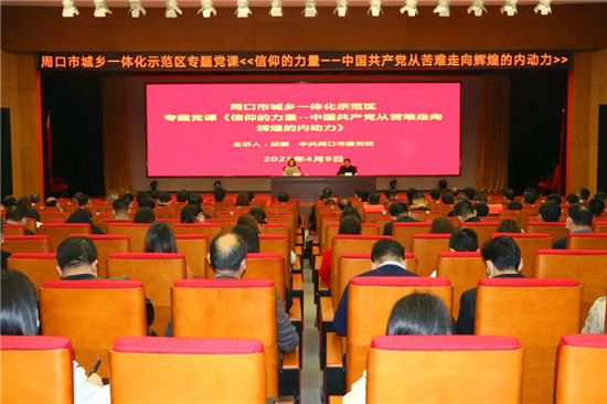為貫徹落實習(xí)近平總書記黨史學(xué)習(xí)教育動員大會重要講話精神,全面推進(jìn)全區(qū)黨史學(xué)習(xí)教育工作,4月9日上午,周口市城鄉(xiāng)一體化示范區(qū)組織專題黨課學(xué)習(xí),邀請中共周口市委黨校黨史黨建教研室主任,副教授紀(jì)穎講授《信仰的力量——中國共產(chǎn)黨從苦難走向輝煌的內(nèi)動力》專題黨課,示范區(qū)副處級以上干部、區(qū)直全體黨員干部、鄉(xiāng)、辦、站、所負(fù)責(zé)人、全體村(社區(qū))支部書記參加會議。