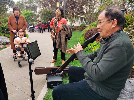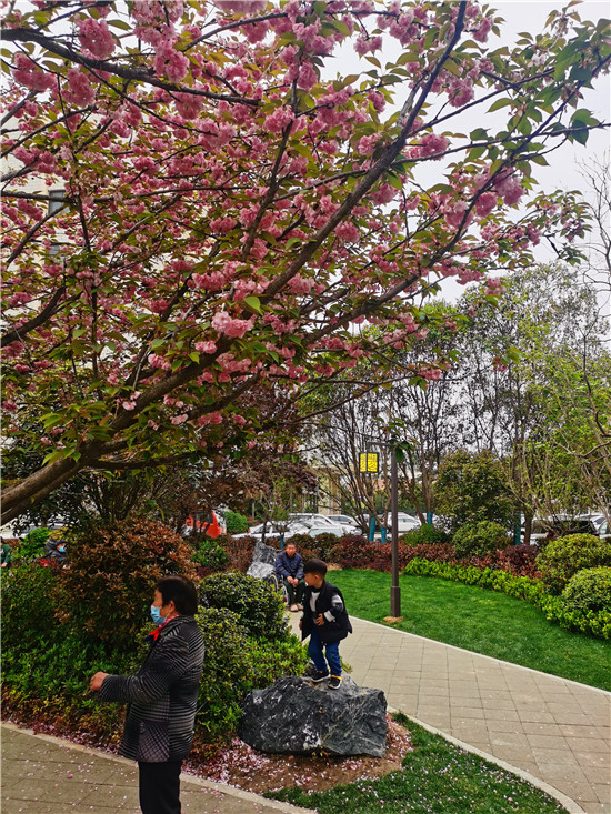 4月12日,中心城區(qū)文明路與七一路交叉口的街頭游園內(nèi),櫻花盛開(kāi),綠坪如茵,老人們?cè)谧詩(shī)首詷?lè),很是幸福愜意。