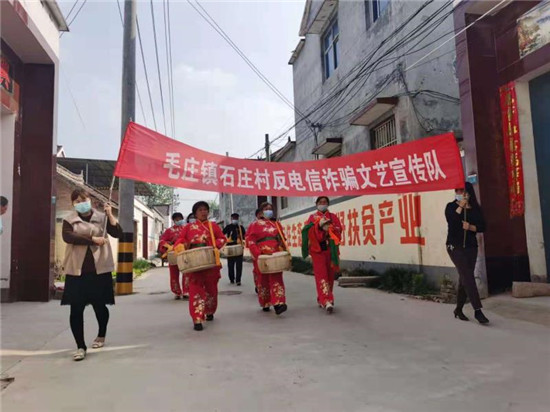 “父老鄉(xiāng)親聽我說(shuō),現(xiàn)在騙子真是多。莫占便宜要牢記,發(fā)家致富靠自己……”毛莊鎮(zhèn)石莊村這樣一支反電詐文藝宣傳隊(duì)瞬間吸引了人們的眼球?!艾F(xiàn)在我村的年輕人大部分都出去掙錢去了,在家的大部分是老人,我們幾個(gè)一合計(jì)把宣傳單上的內(nèi)容編成順口溜,這樣更好懂、更好記!”石莊村文藝宣傳隊(duì)的張秀芬笑著說(shuō)。