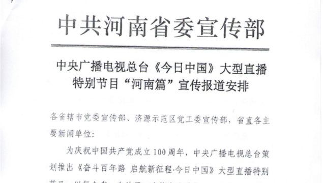 中央廣播電視總臺(tái)《今日中國》大型直播特別節(jié)目“河南篇”宣傳報(bào)道安排